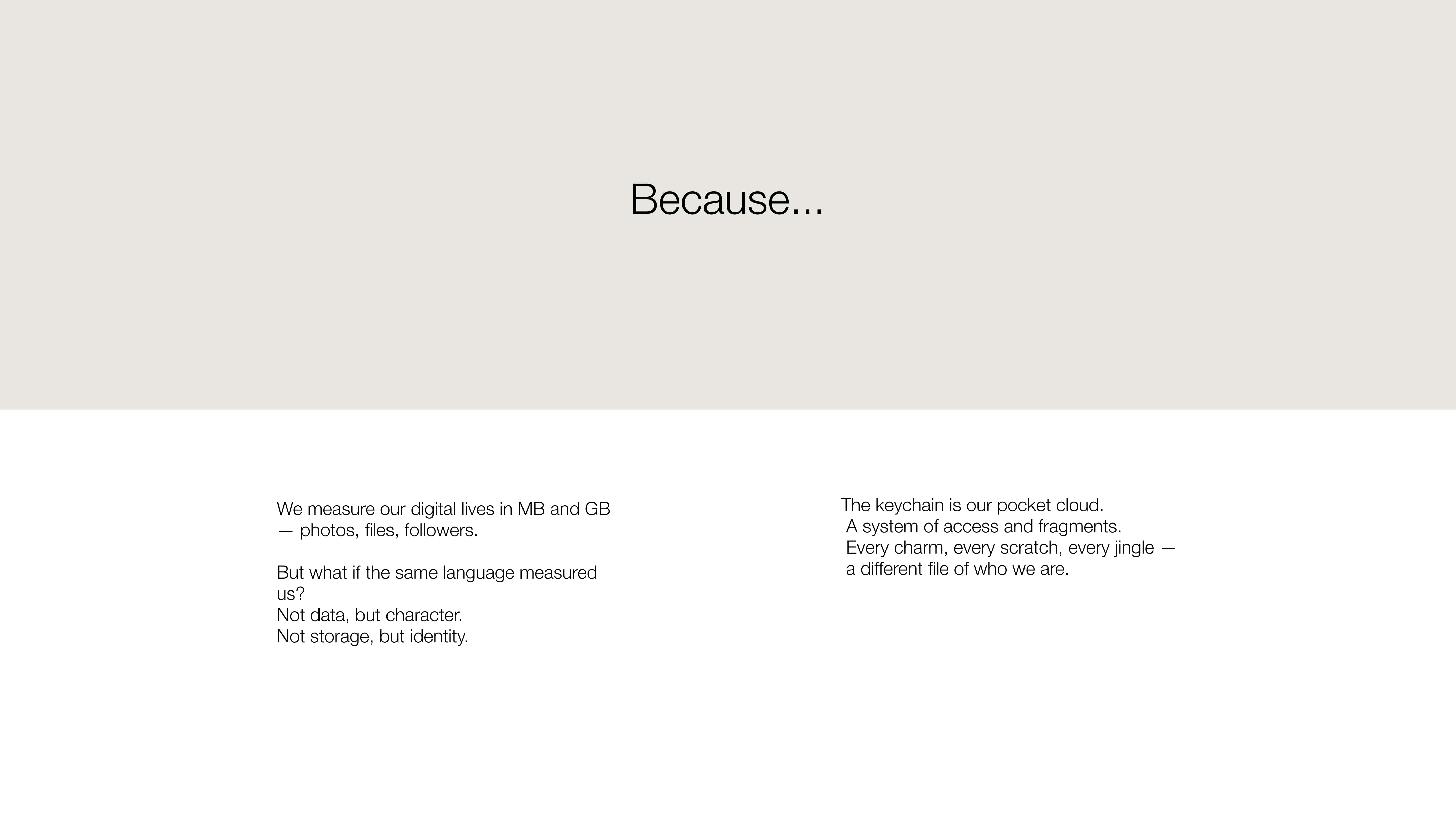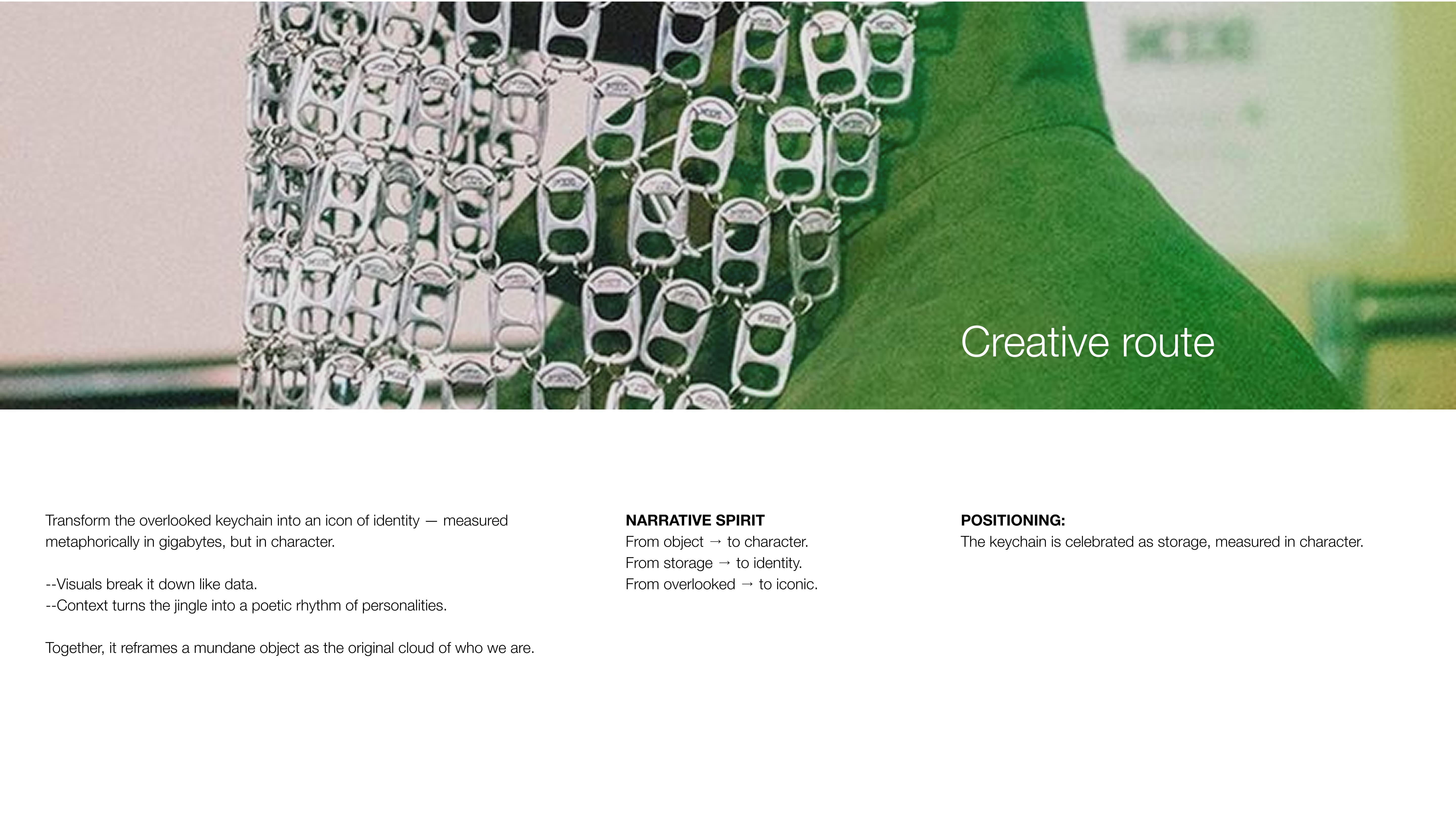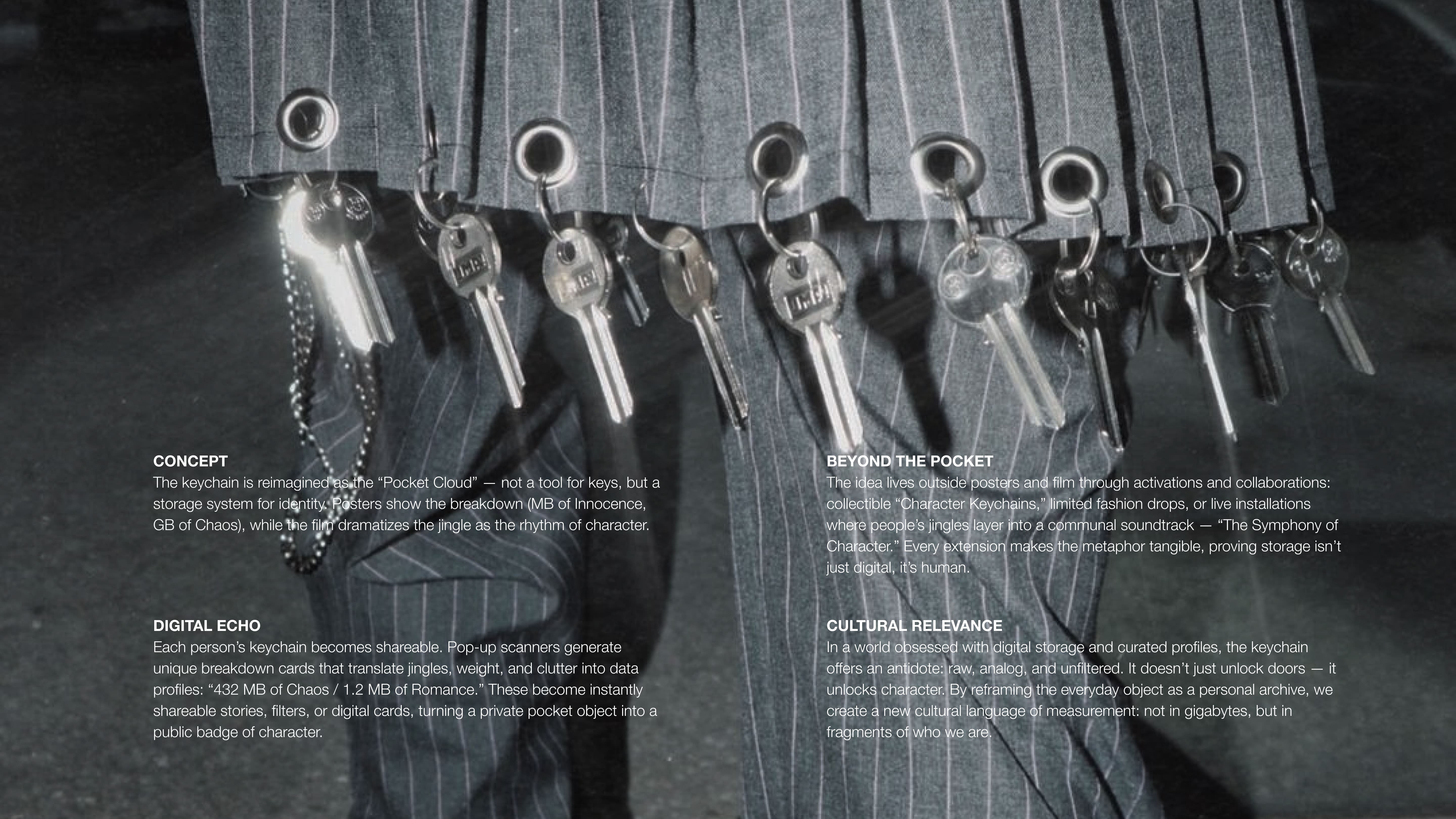 Visually and verbally, the campaign breaks the keychain down like data, turning its noise into poetry and its weight into meaning, inviting people to see it as the original cloud of who they are. From posters and films to digital “breakdown cards” that translate keychains into identity profiles, the project transforms a mundane object into an icon of personality. Storage, measured in character.