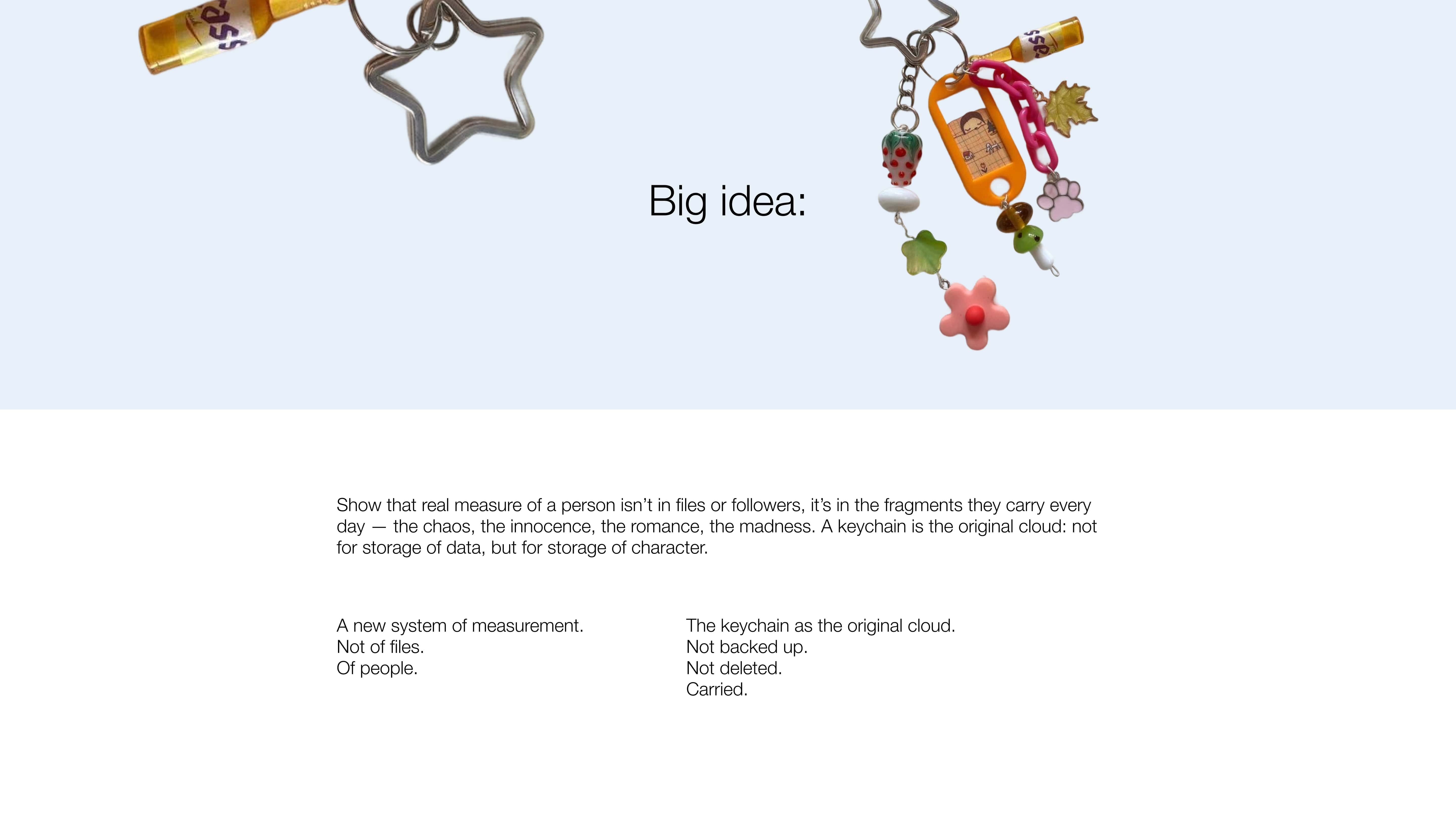 Instead of treating it as something small and functional, the campaign reframes the keychain as a pocket-sized archive of identity: raw, unfiltered and deeply human. In a world obsessed with gigabytes, data, photos and followers, the idea proposes that the real cloud has always been analog: the keychain. Every charm, scratch and jingle becomes storage measured not in MB or GB, but in character — chaos, romance, childhood, routine. An everyday object reimagined as a storage system for identity.