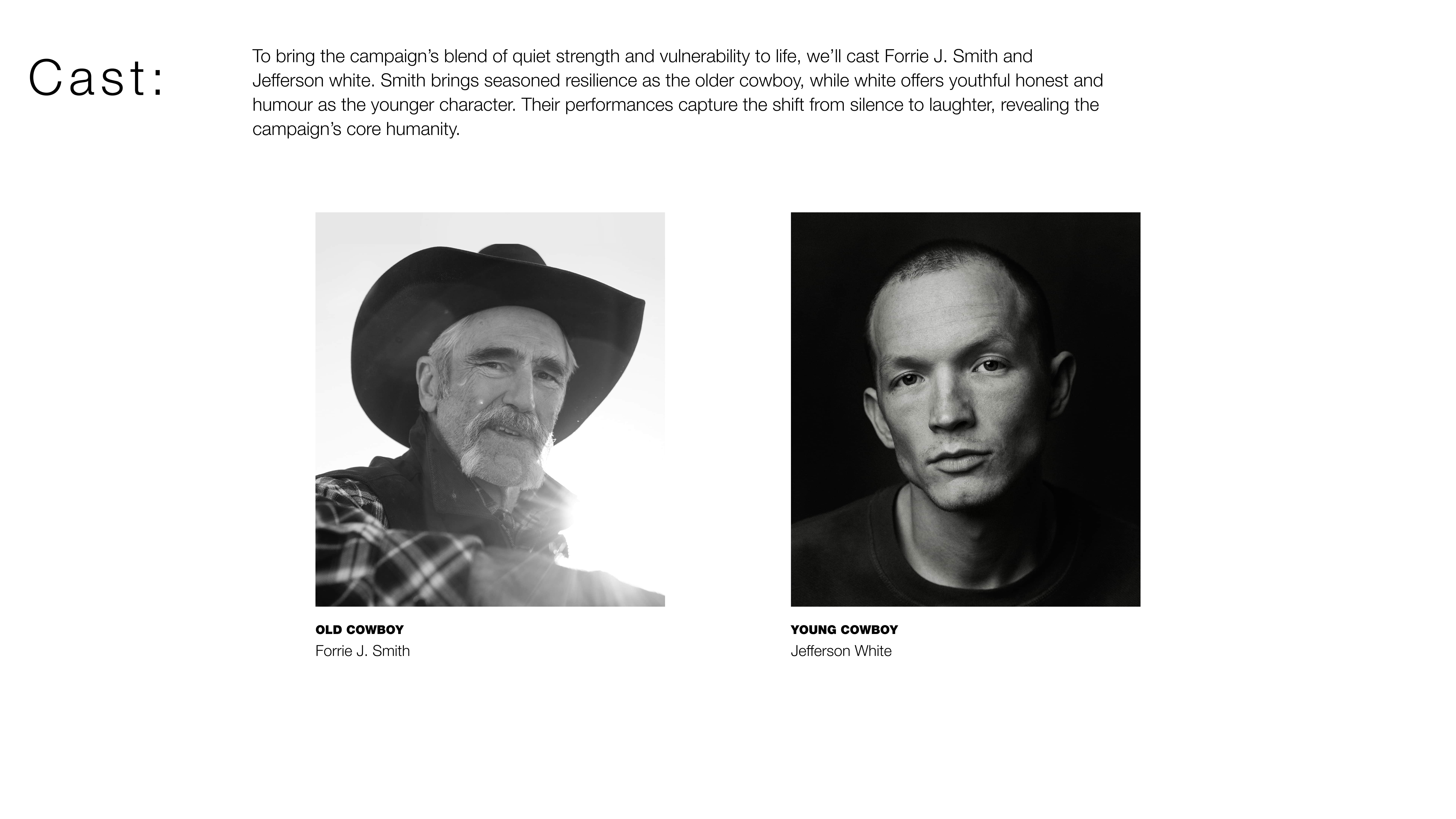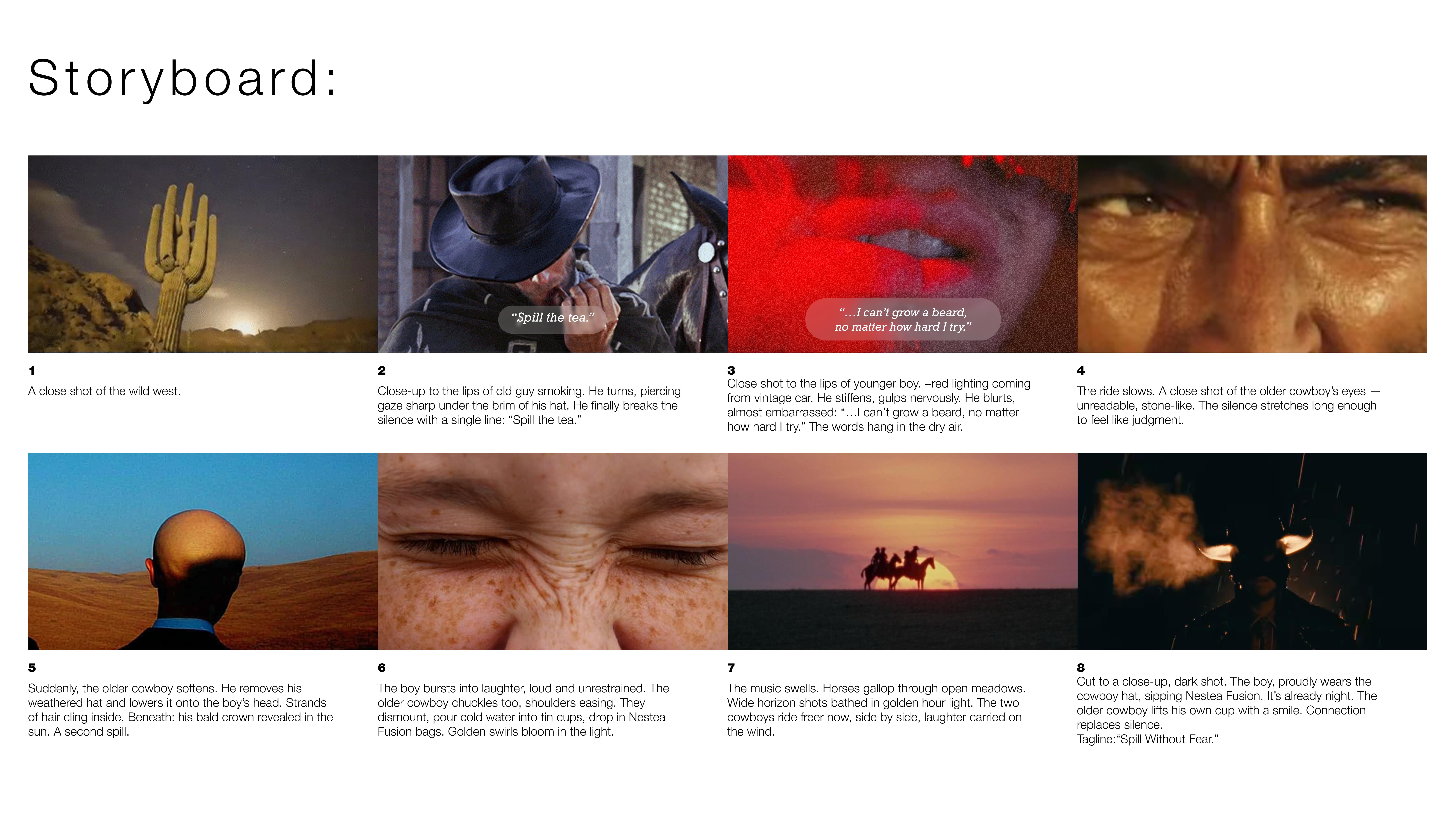 Two cowboys ride across wide, golden plains. Their faces are unreadable, carved by silence. The older cowboy breaks the stillness with a challenge: “Spill the tea.” The younger one hesitates, then blurts out his secret: he can’t grow a beard. What follows is a moment of unexpected humanity. The older cowboy removes his hat to reveal his own bald head, strands of hair clinging inside. Laughter breaks the silence. They share Nestea Fusion and as the music swells, we shift into lyrical Western beauty — galloping horses, glowing horizons, two riders side by side. From stone-cold stillness to laughter. From silence to spill.