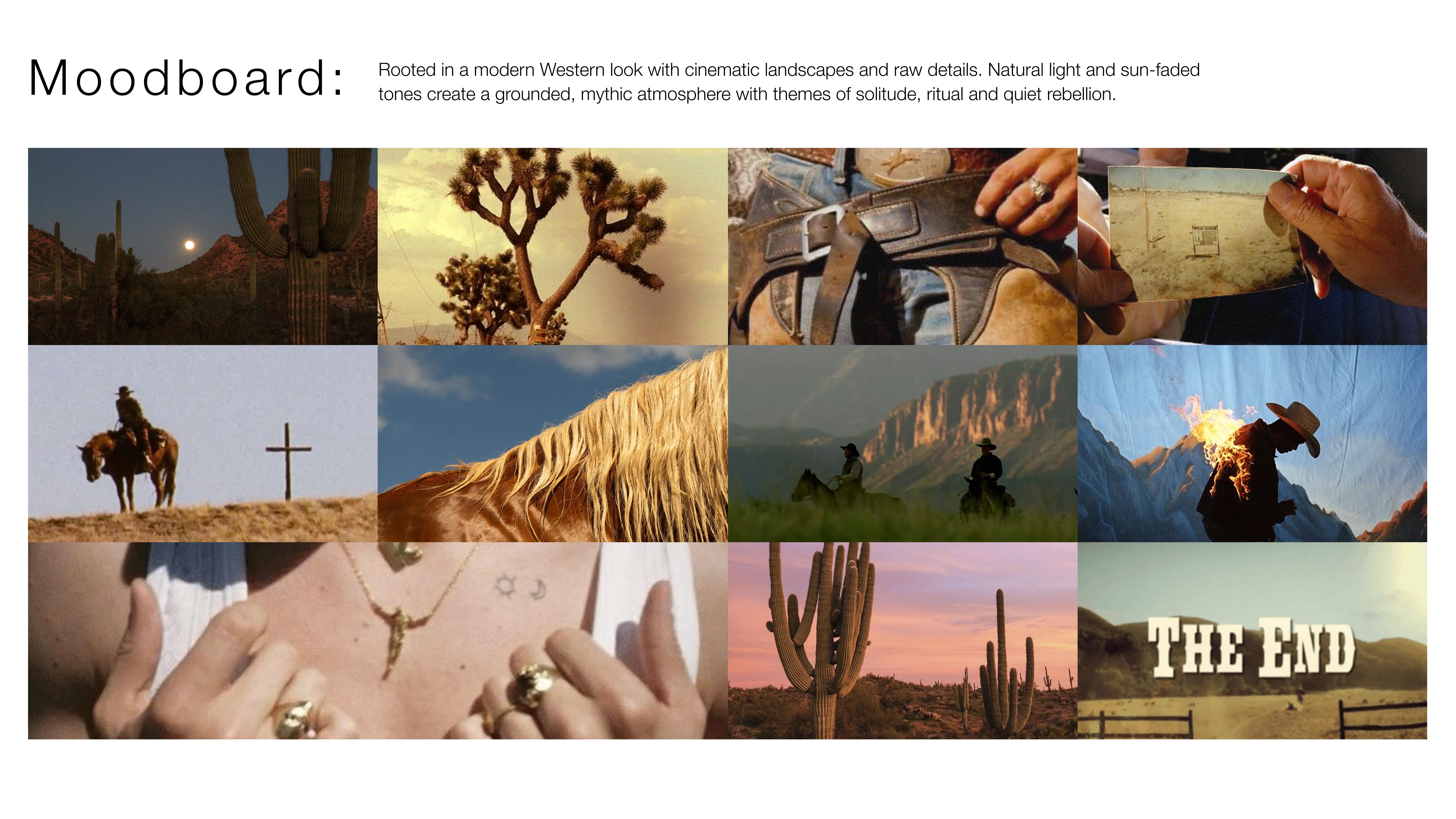 A cinematic and romantic tone, inspired by Western and Americana films without feeling like a parody. Wild horizons, golden light, and weathered textures set the scene. It’s quiet, grounded and intimate.