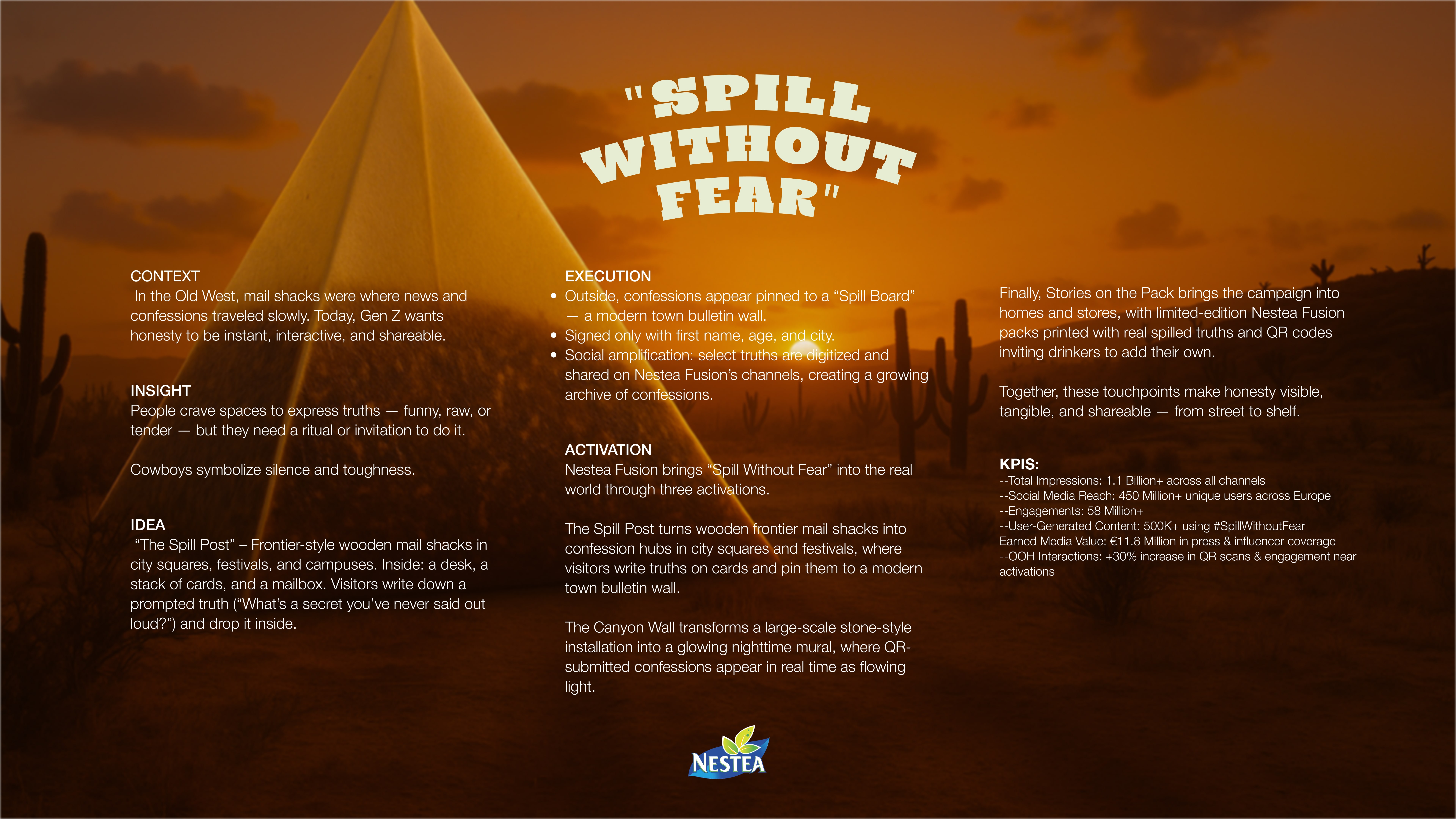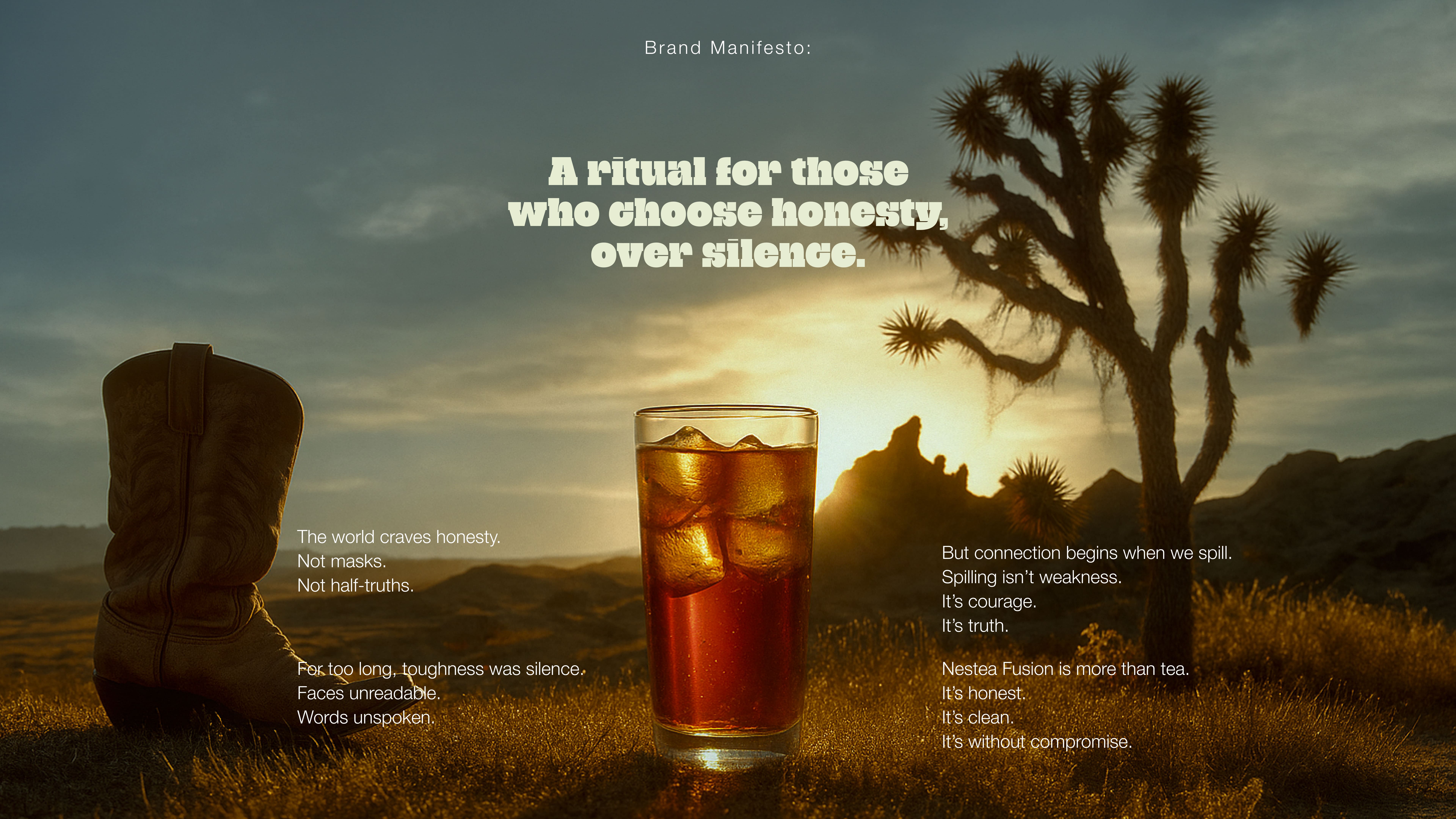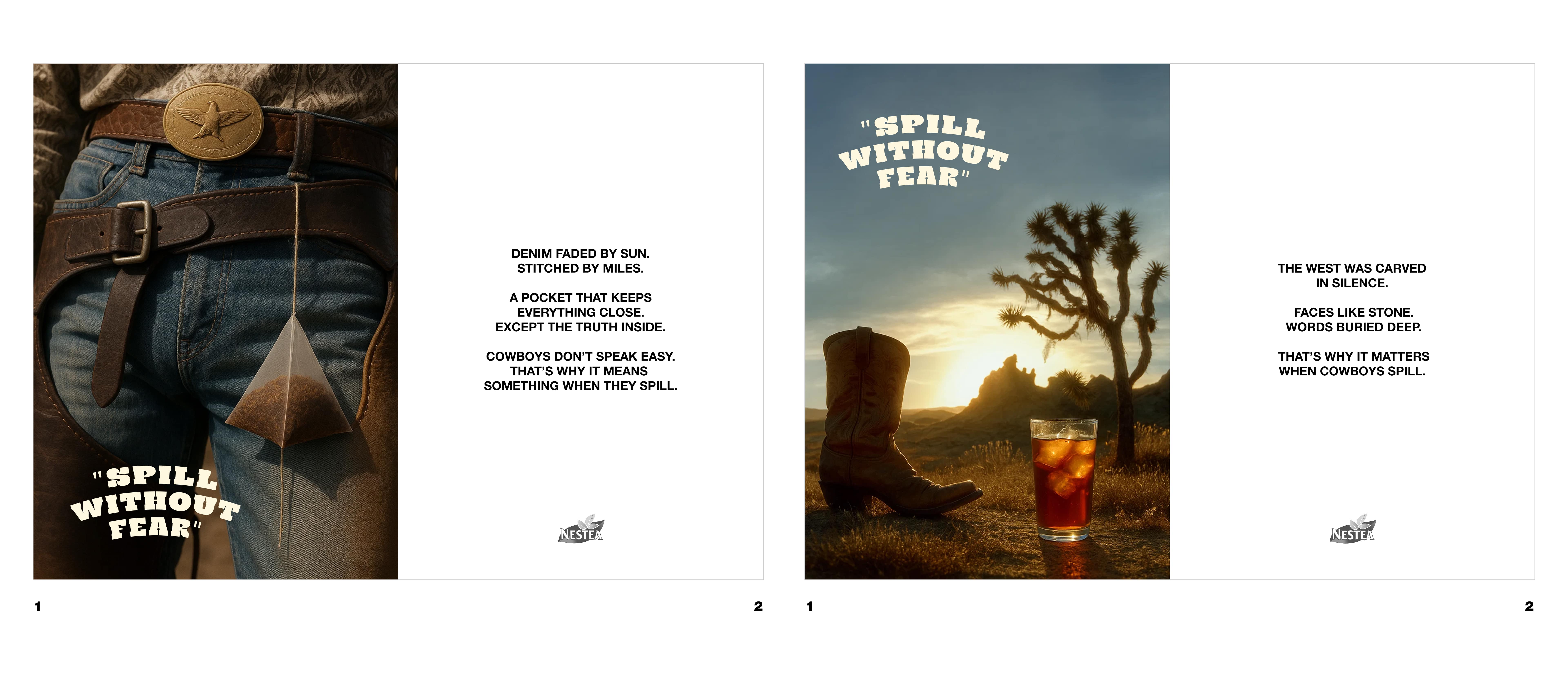 "The Art of Spill" campaign (Western Edition) reimagines Nestea for a generation that craves honesty over polish. In a world where traditional tea feels slow and the iced-tea aisle is crowded, the campaign uses the Western archetype — cowboys defined by silence and restraint to show that spilling what’s inside isn’t weakness but courage.